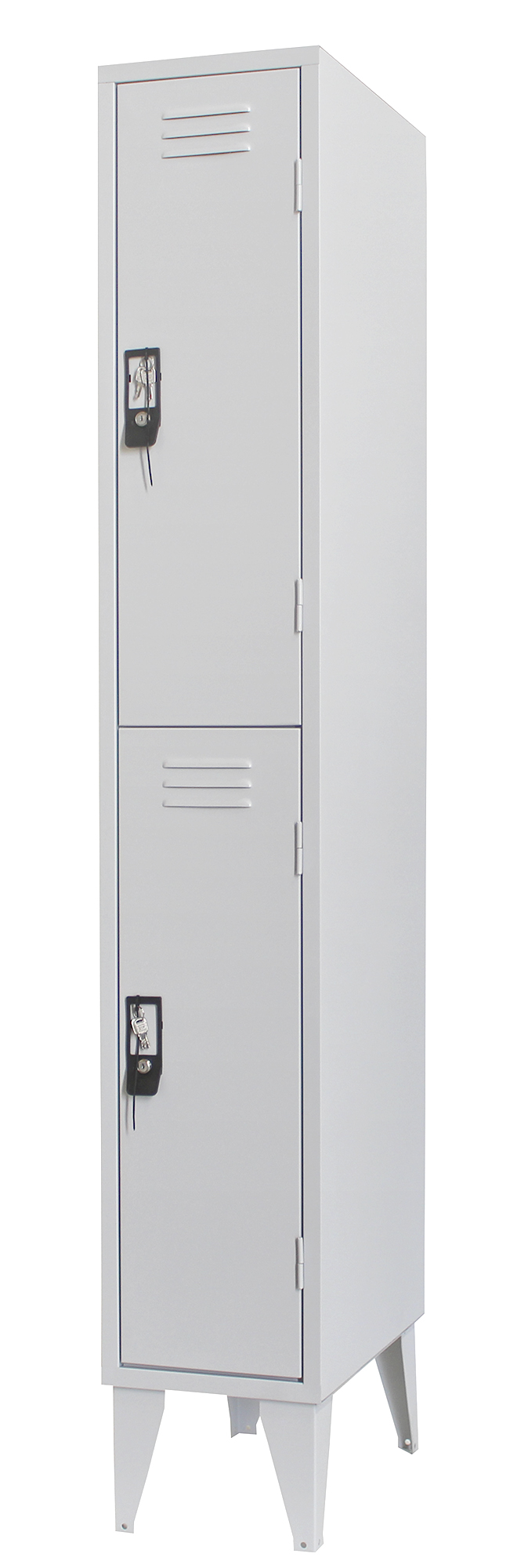 Os armários simples de 2 portas sobrepostas são ideais para quem tem equipas de trabalho e que necessitam de armazenar a sua roupa ou pertences com segurança, pois cada pessoa tem a sua chave e facilmente pode ter guardado os seus bens. No interior de cada cacifo tem um porta calças, um cabide, um porta etiquetas e uma zona de respiração. Disponível sob encomenda noutras cores.