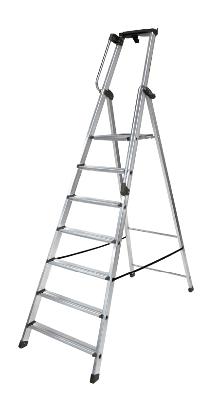 Escadote Robusto e seguro, adequado para utilização profissional intensiva. Degraus antiderrapantes com 80mm, fixados por cravação.