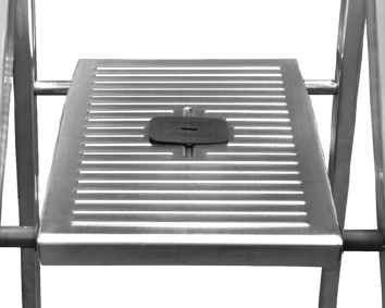 Equipado com 2 corrimões laterais de 430mm e 730mm, em aço galvanizado e Prateleira porta-objectos, compartimentada, com régua de escala graduada, com gancho para balde de peso até 30 kg. Articulações robustas e resistentes ao uso intensivo. Ampla plataforma antiderrapante de elevado conforto, 400x275mm, em aço galvanizado.