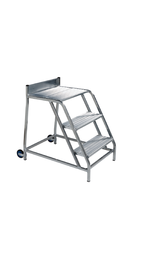 Amplos degraus antiderrapantes em Alumínio 200mm e com plataforma de superfície anti-derrapante de 420x600mm.